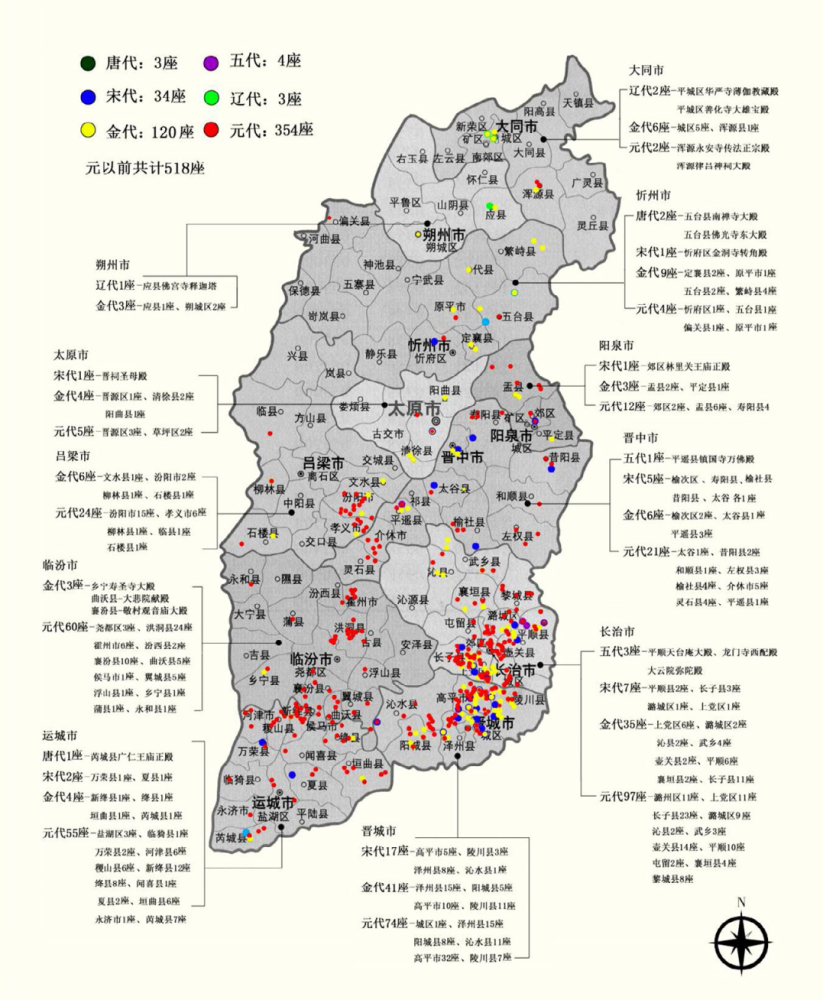 山西省唐至元木构建筑分布统计图 图片来源:澎湃新闻